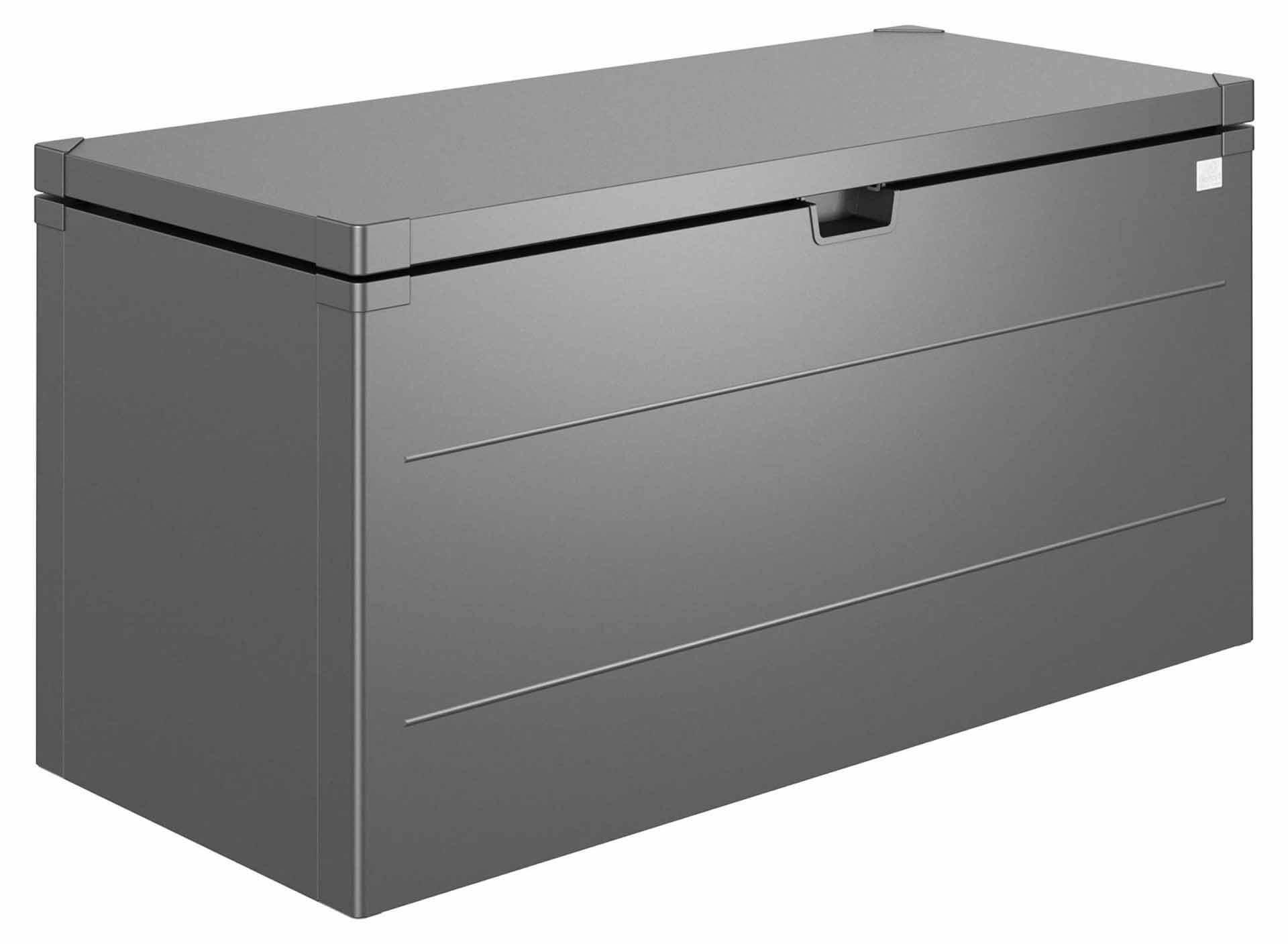 Die Biohort Stylebox 140 hat eine Größe von 140x60x71cm und einem ansprechenden dunkelgrau-metallic Farbton. Die Lieferung erfolgt zerlegt, jedoch gestaltet sich die Montage mühelos. Mit einer Deckelöffnung dank Gasdruckfeder erleichtert sie den Zugang. Die Kissenbox ist regendicht und verfügt über eine integrierte Lüftung für optimale Lagerbedingungen. Eine gelungene Kombination aus Funktionalität, Design und Wetterbeständigkeit für stilvolle Aufbewahrung im Außenbereich.