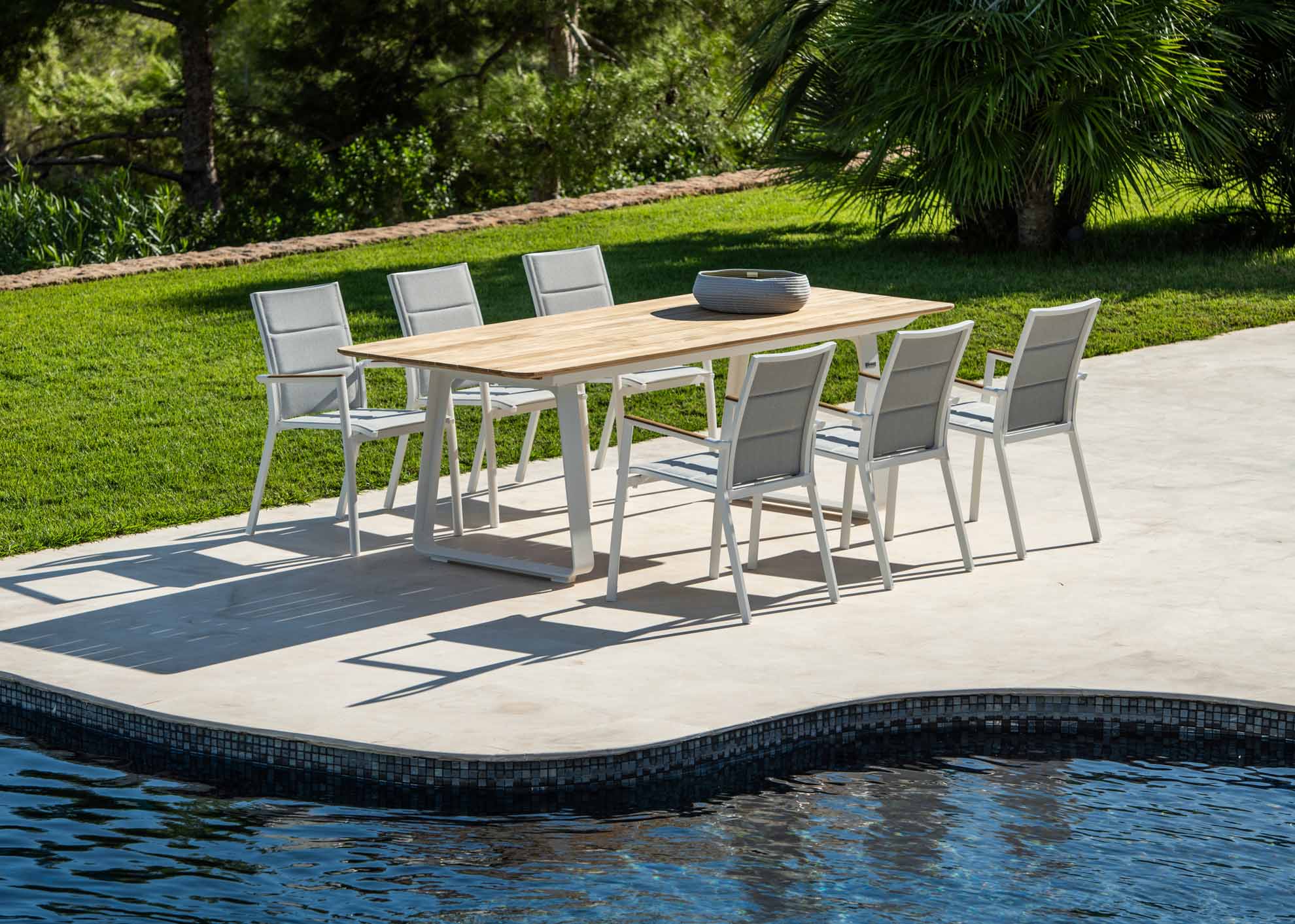 Wir verwenden ausschließlich Teakholz aus kontrolliertem Anbau. Teakholz gehört zu den wertvollsten Nutzhölzern der Welt. Ein hoher Kautschukgehalt bewirkt unter anderem eine starke Wasserabweisung. Das Holz widersteht nicht nur problemlos Nässe, Sonne, Frost und Temperaturschwankungen, sondern besitzt auch eine hohe Resistenz gegen Ungeziefer und Insekten. Teakholz ist zum Dauereinsatz im Freien besonders geeignet. Die meisten Teakmöbel werden naturbelassen geliefert. Im Laufe der Zeit bekommt das Holz durch Witterungseinflüsse eine silbergraue Patina.