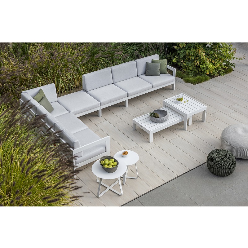 Vigo von Jati & Kebon besteht aus einer schlanken, leichten Aluminiumkonstruktion. Die puristisch konstruierte Form wirkt modern und stilvoll. Eine wetterfeste, pulverbeschichtete Oberfläche garantiert den ganzjährigen Verbleib im Freien und sorgt für eine einfache Pflege der Möbel. Mit maßgefertigten Sitzkissen aus unserem Zubehör (nicht im Lieferumfang enthalten) wird Vigo zu einer äusserst gemütlichen Outdoor-Lounge. Die Module der Vigo-Kollektion sind einzeln aufstellbar oder lassen sich ebenso zu einer großzügigen Sitzgruppe erweitern. Erstellen Sie mit Vigo Ihre eigene, individuelle Terrassengarnitur.